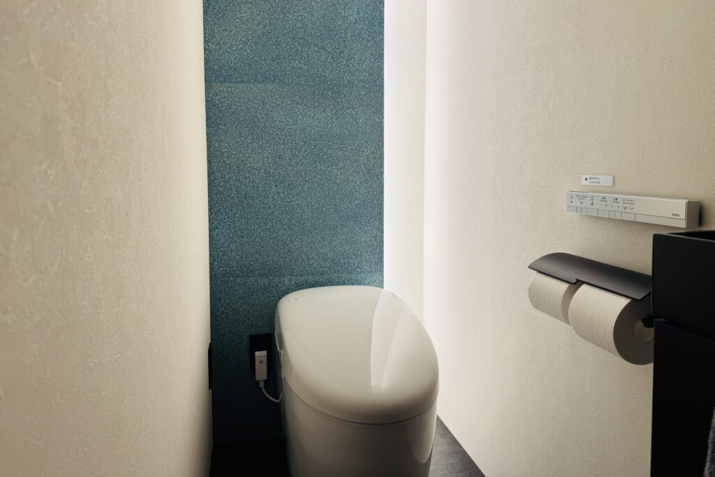 トイレは1階、2階にございます。1階のトイレは、美しい和紙がやわらかな光を受けてきらめき、落ち着いた和の雰囲気を演出しています。