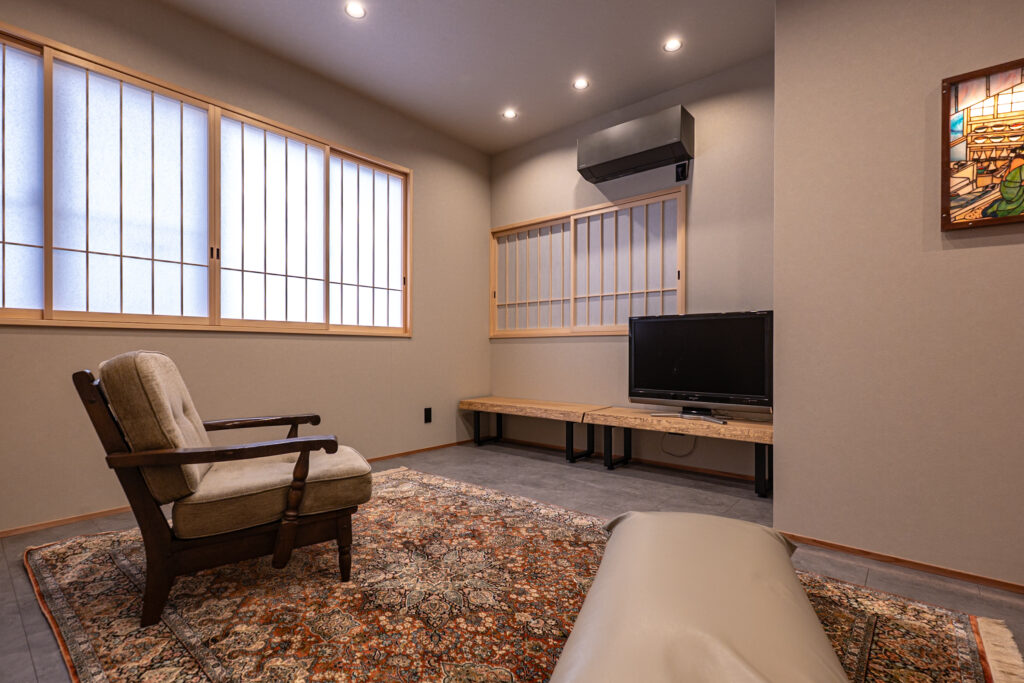 ダイニングルームの奥には、ゆったりとくつろげるお部屋をご用意しています。お子様がゲームをしたり、ご家族でのんびり過ごしたりと、思い思いの時間をお楽しみいただけます。