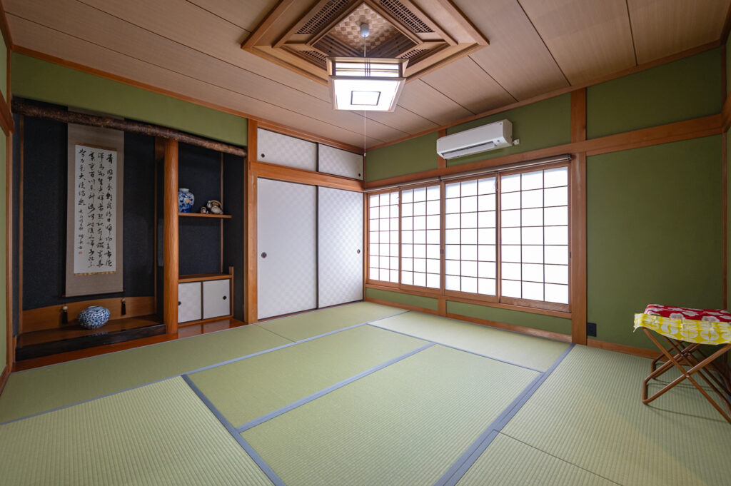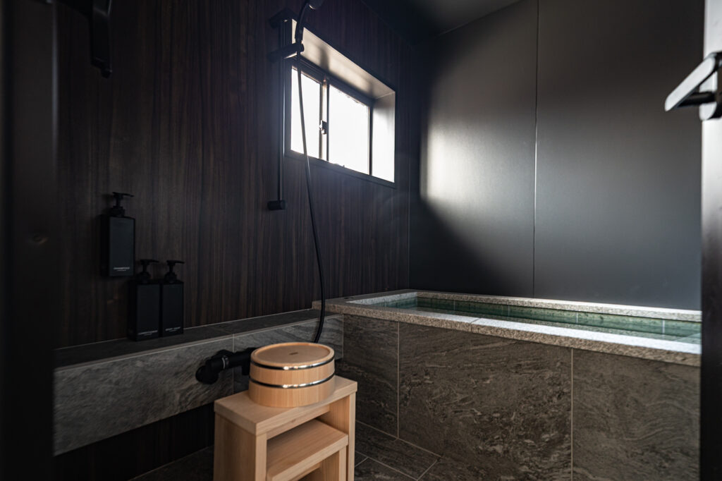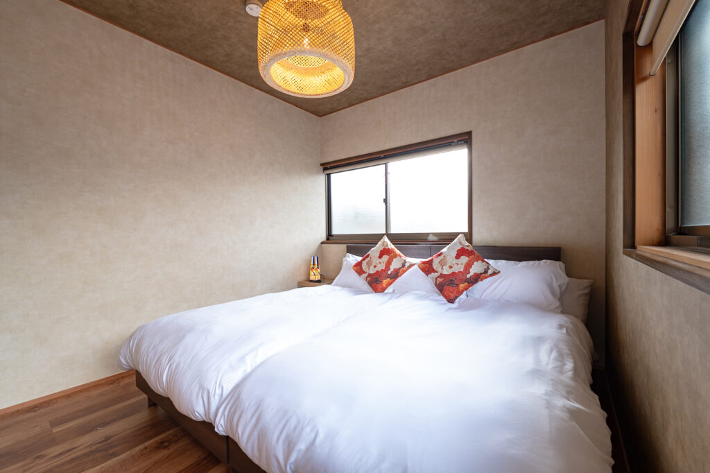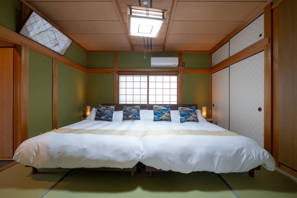 畳の和室にはダブルベッドを2台ご用意しており、ご家族4名様でも快適にお泊まりいただけます。障子から差し込む柔らかな光と、自然素材に包まれた穏やかな空間の中で、心も身体もリセットされるひとときをお過ごしください。ベッドや敷布団には、日本の風土と気候に合わせた高級素材「ブレスエアー」を採用。通気性と弾力性に優れ、旅の疲れをやさしく癒します。